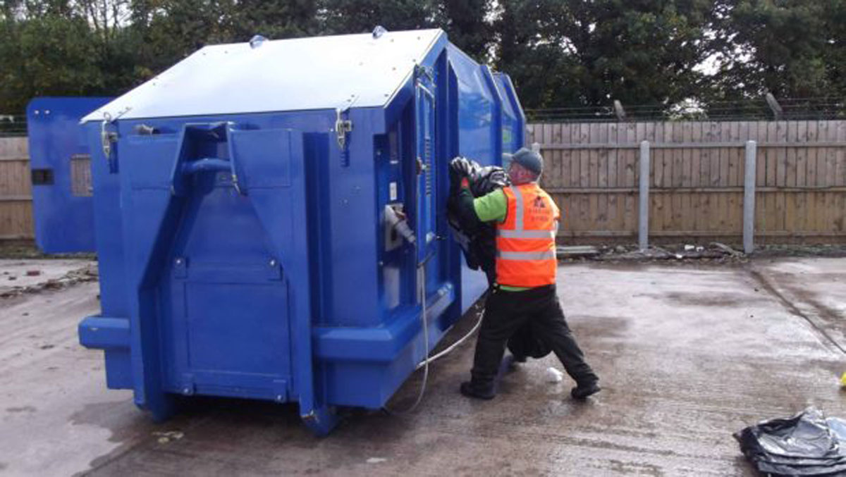 Loading doors located to both sides together with a large front/top loading door suitable for tipping skips.